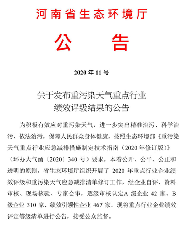 荣盛耐材获评重污染天气重点行业“绩效引领性企业” 10月26日,在河南省生态环境厅印发了《关于发布重污染天气重点行业绩效评级结果的公告》(〔2020〕年11号)中,郑州......